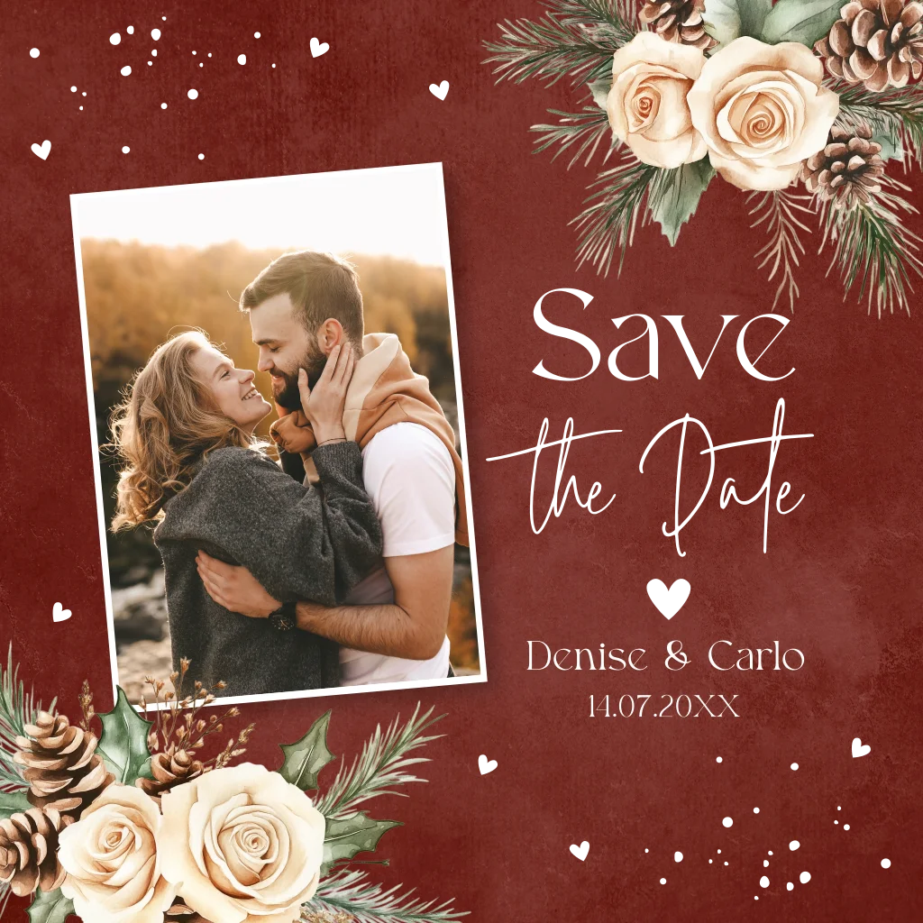 Save the Date kerstkaart met eigen foto, rood met bloemen en goudfolie.
