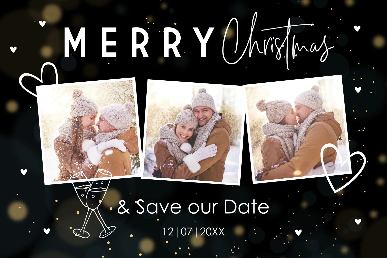Mooie sprankelende Save the Date kerstkaart zwart met fotocollage, spetters en goudfolie.