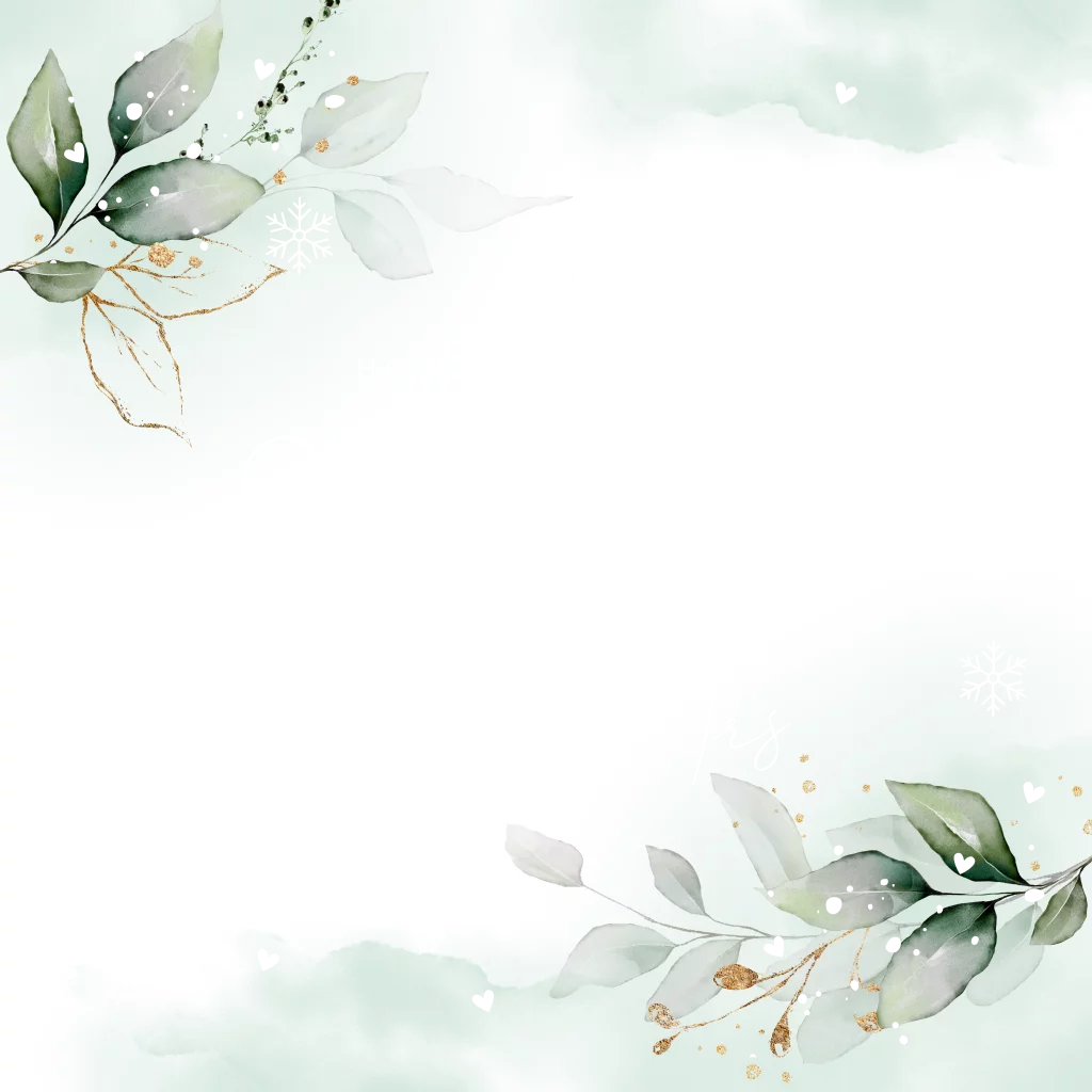 Save the Date kerstkaart groen met botanische bladeren, aquarel, sneeuwvlokken, hartjes en goudfolie.
