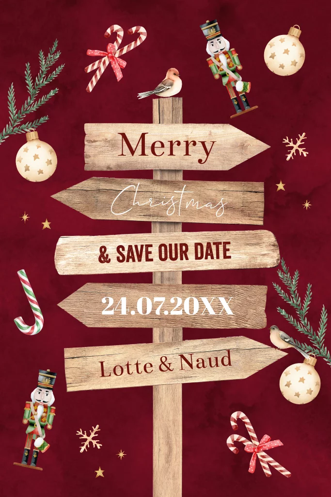 Save the Date kerstkaart rood wegwijzer hout kerstfiguurtjes