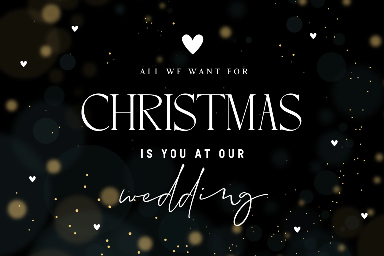 Mooie stijlvolle Save the Date kerstkaart zwart met hartjes, spetters en goudfolie.