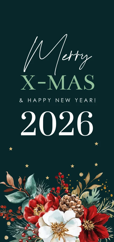 Kerstkaart langwerpig met mooie kerst bloemen rood groen.