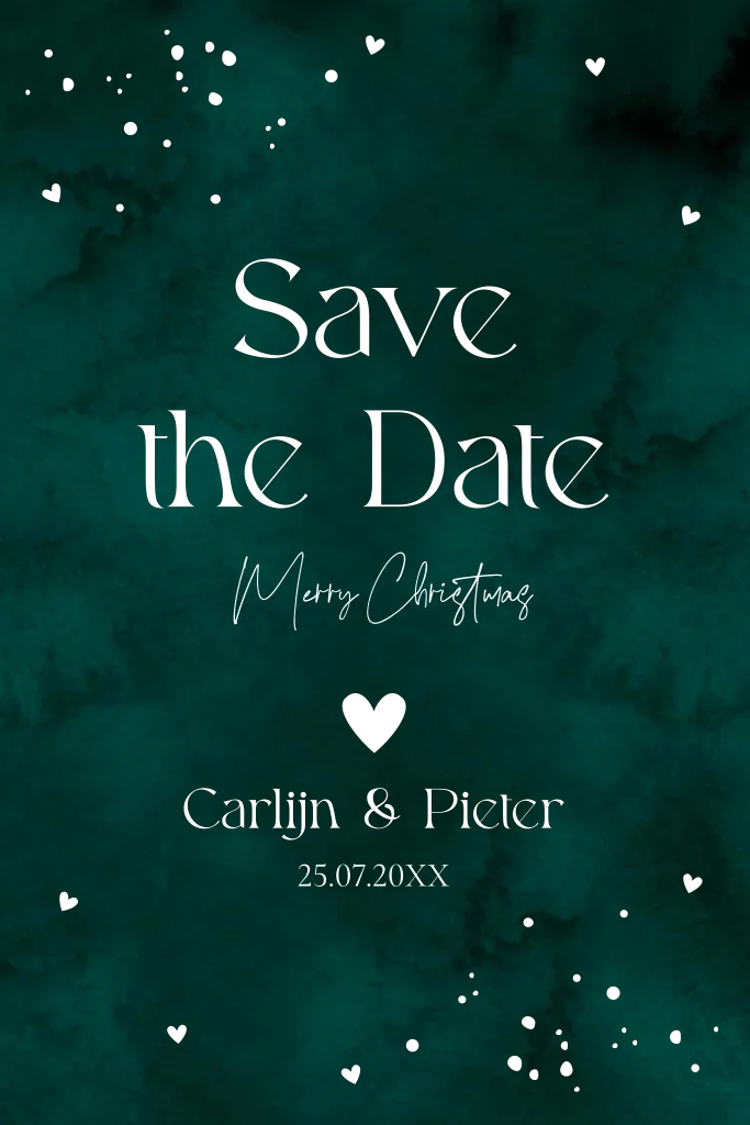Stijlvolle Save the Date kerstkaart groen met goudfolie.