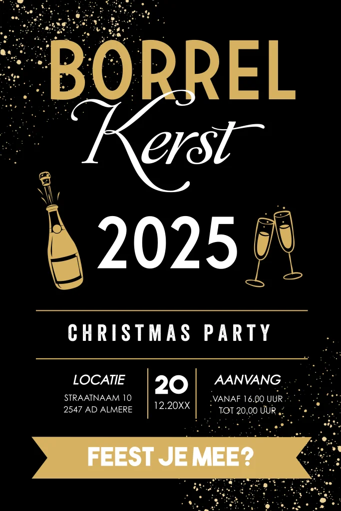 Kerstborrel uitnodiging zwart met goudlook typografie. Geen folie!