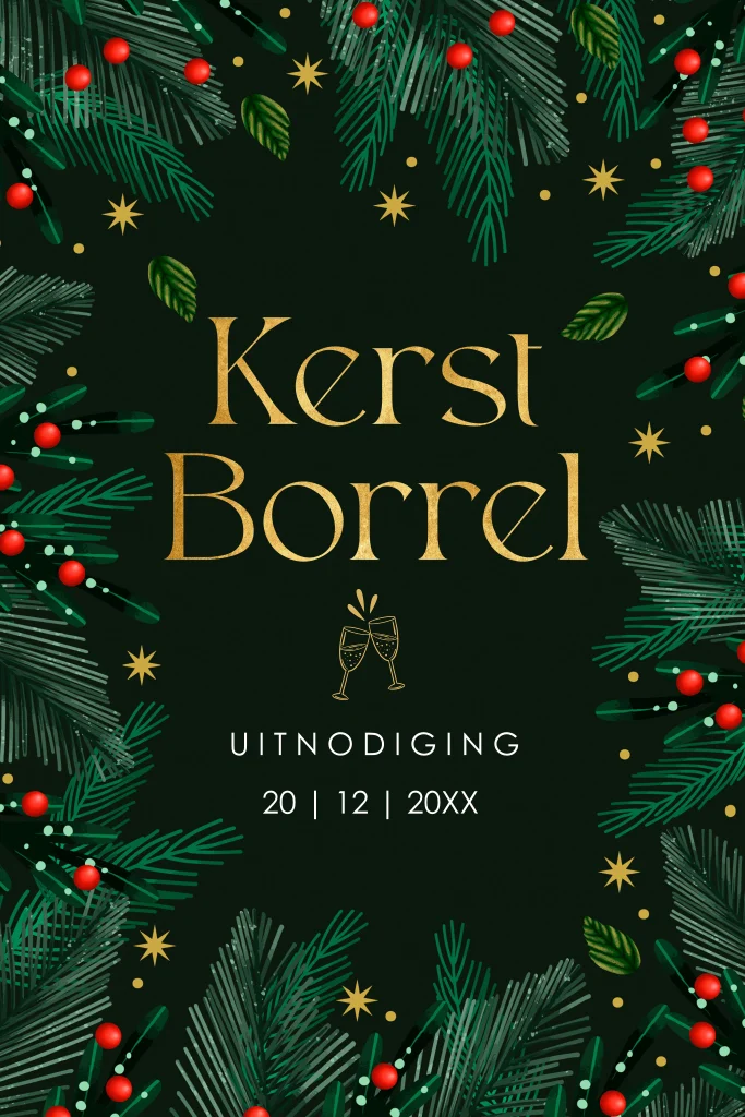 Zakelijke uitnodiging kerstborrel groen met kersttakjes en goudlook. Nodig collega's, vrienden of familie in stijl uit met deze mooie uitnodiging.