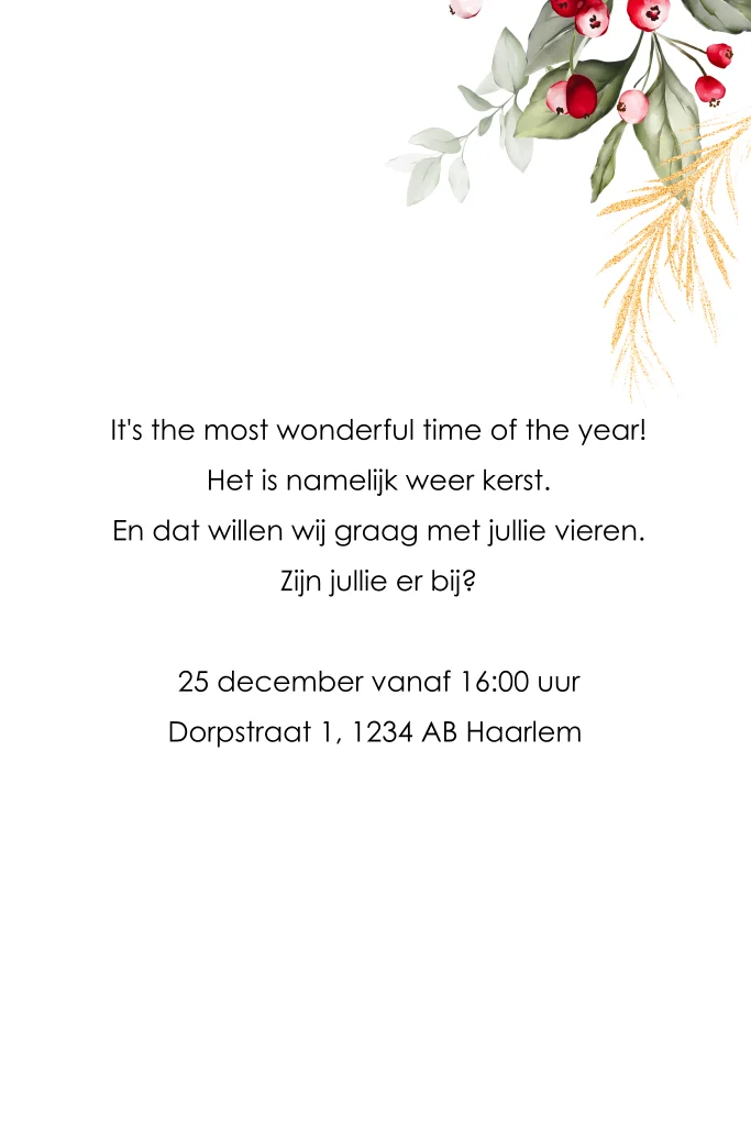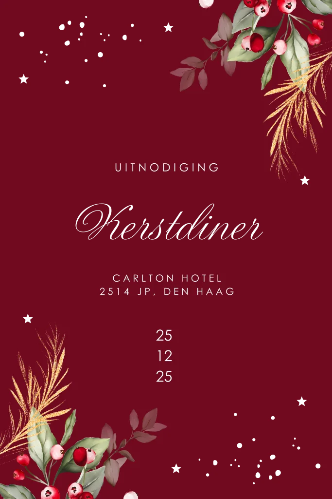 Uitnodiging kerstdiner rood met kersttakjes en goudfolie.