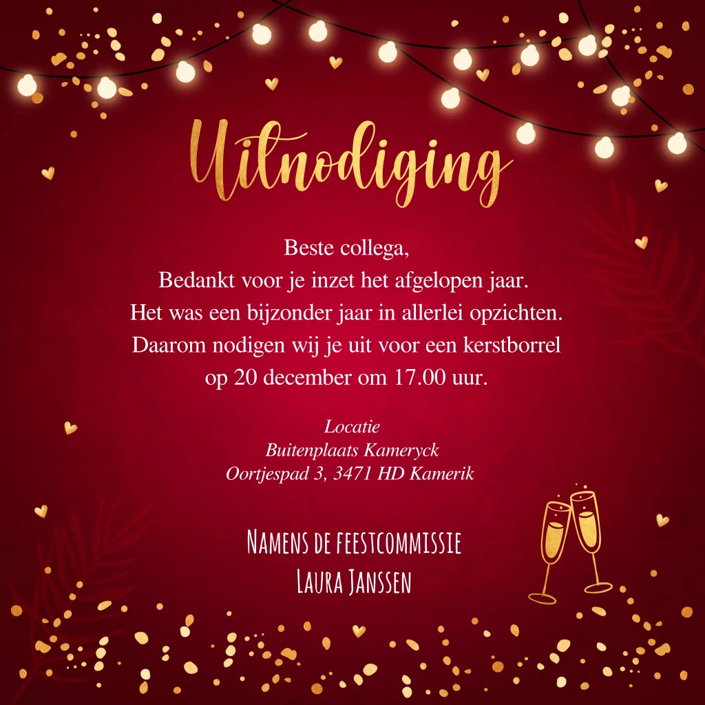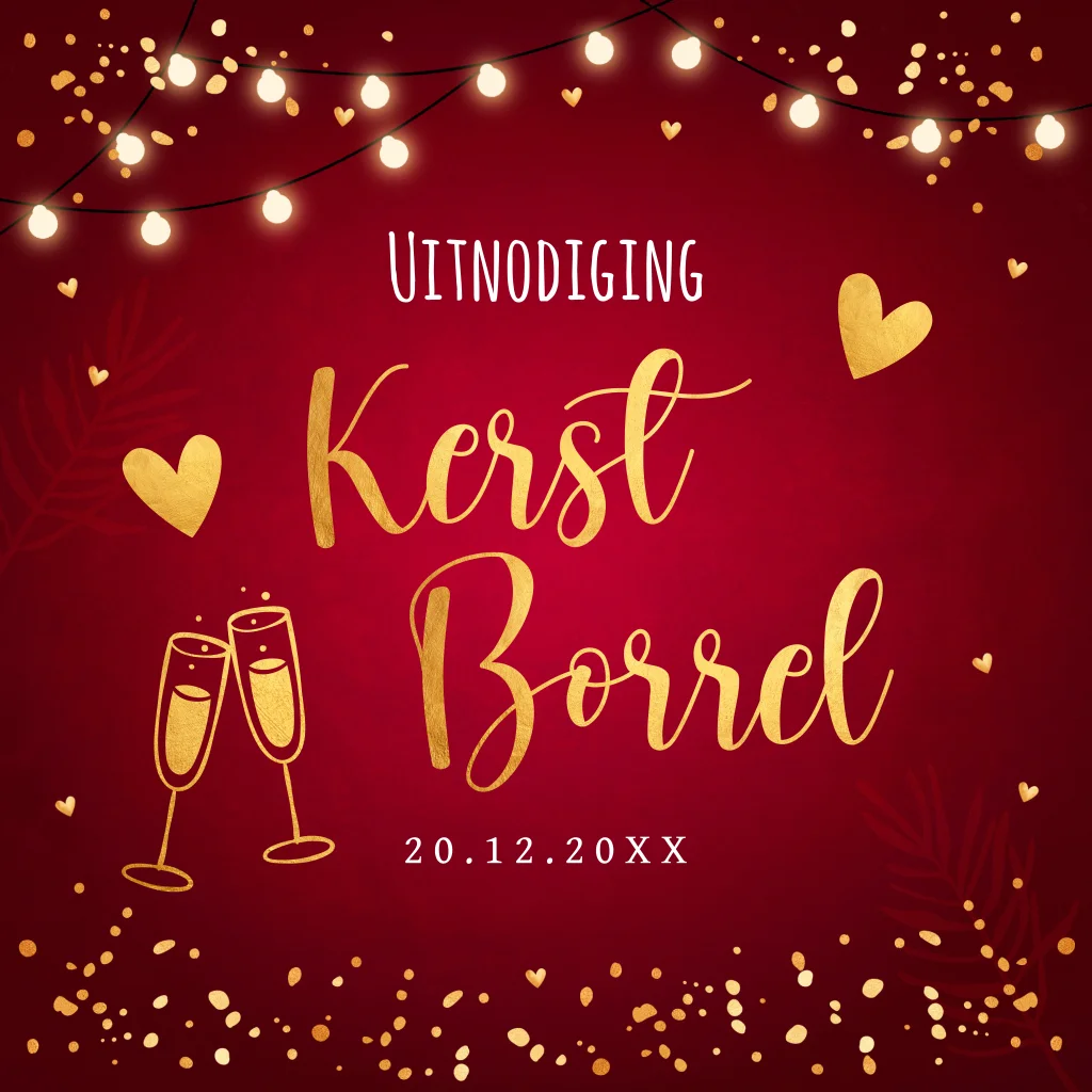 Uitnodiging kerstborrel rood met lampjes en confetti in goudlook. Geen foliedruk. Nodig collega 's, vrienden of familie uit met deze mooie kerstborrel uitnodiging.