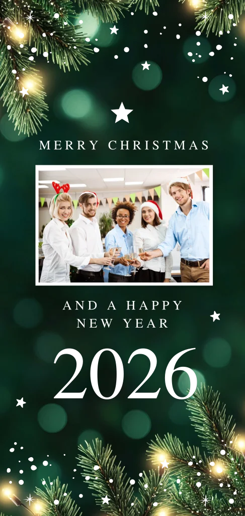 Zakelijke kerstkaart langwerpig groen met foto, kersttakjes, typografie 2026 en goudfolie.