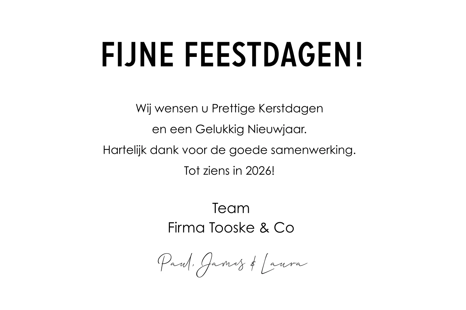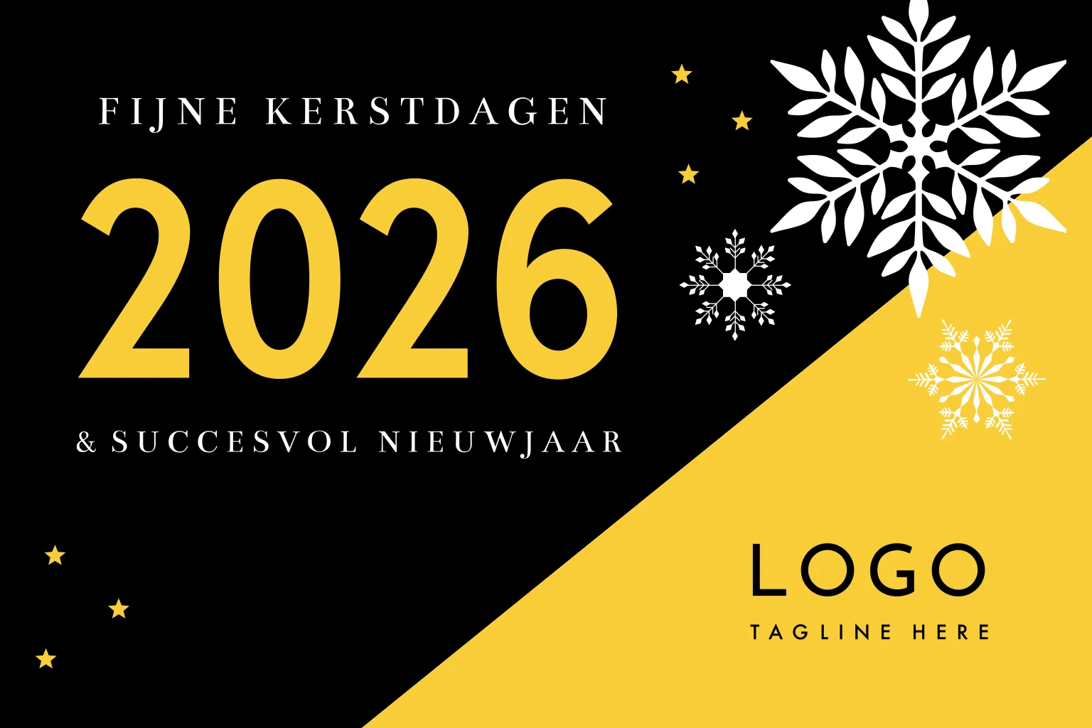 Zakelijke kerstkaart modern geel zwart met jaartal 2026, sneeuwvlokken en logo. Pas de kleuren naar wens aan!
