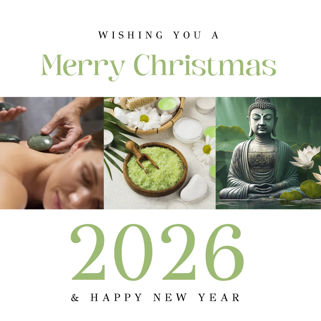 Zakelijke kerstkaart groen met foto's van massage, boeddha, wellness. Deze zakelijke kaart is geschikt voor bedrijven in de beauty, haar en wellness branche, zoals een schoonheidssalon.