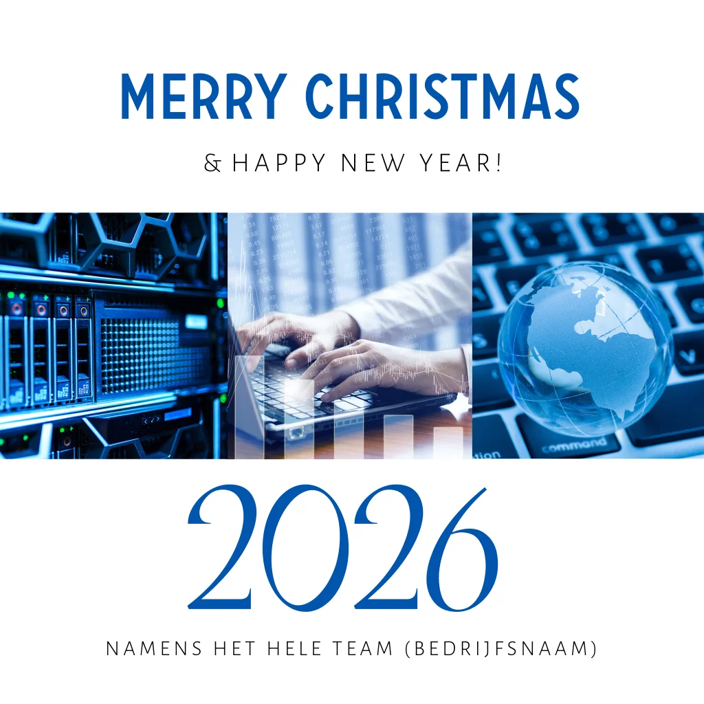 Zakelijke kerstkaart blauw voor bedrijven met sfeervolle foto's van een laptop of computer, een wereldbol en servers. Op deze kaart is het mogelijk om op de binnenzijde een eigen bedrijfslogo toe te voegen. Deze kaart is voor alle branches en sectoren geschikt, maar met name ook voor de digitale branche, internationale en zakelijke dienstverlening. De gebruikte foto's zijn ook te vervangen voor eigen bedrijfsfoto's. Hulp nodig bij het aanpassen van deze kaart? We helpen je graag!