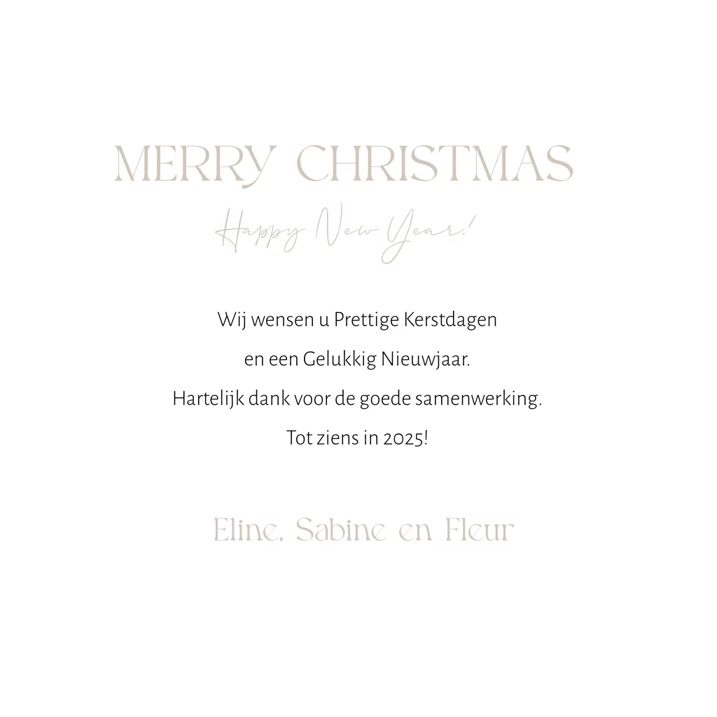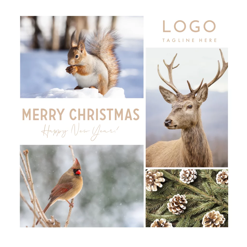 Zakelijke kerstkaart wit beige met bosdieren, vogel, eekhoorn en hertje. Wens je klanten prettige kerstdagen en een Gelukkig Nieuwjaar met deze mooie zakelijke kerstkaart, speciaal voor een bedrijf in de sector natuur.