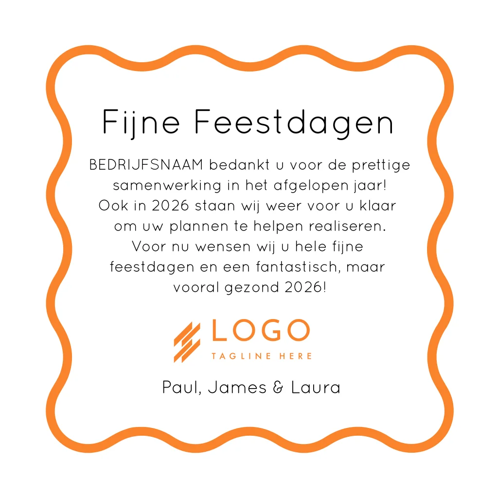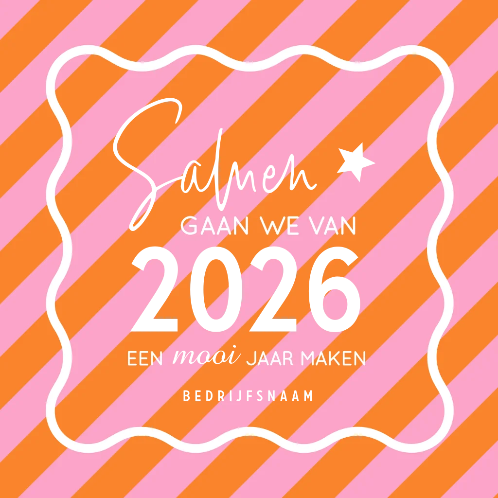 Zakelijke kerstkaart oranje roze strepen met golvend kader, jaartal 2026 en holografische folie.