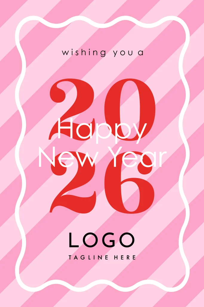 Zakelijke kerstkaart roze strepen met logo, jaartal 2026 en goudfolie.