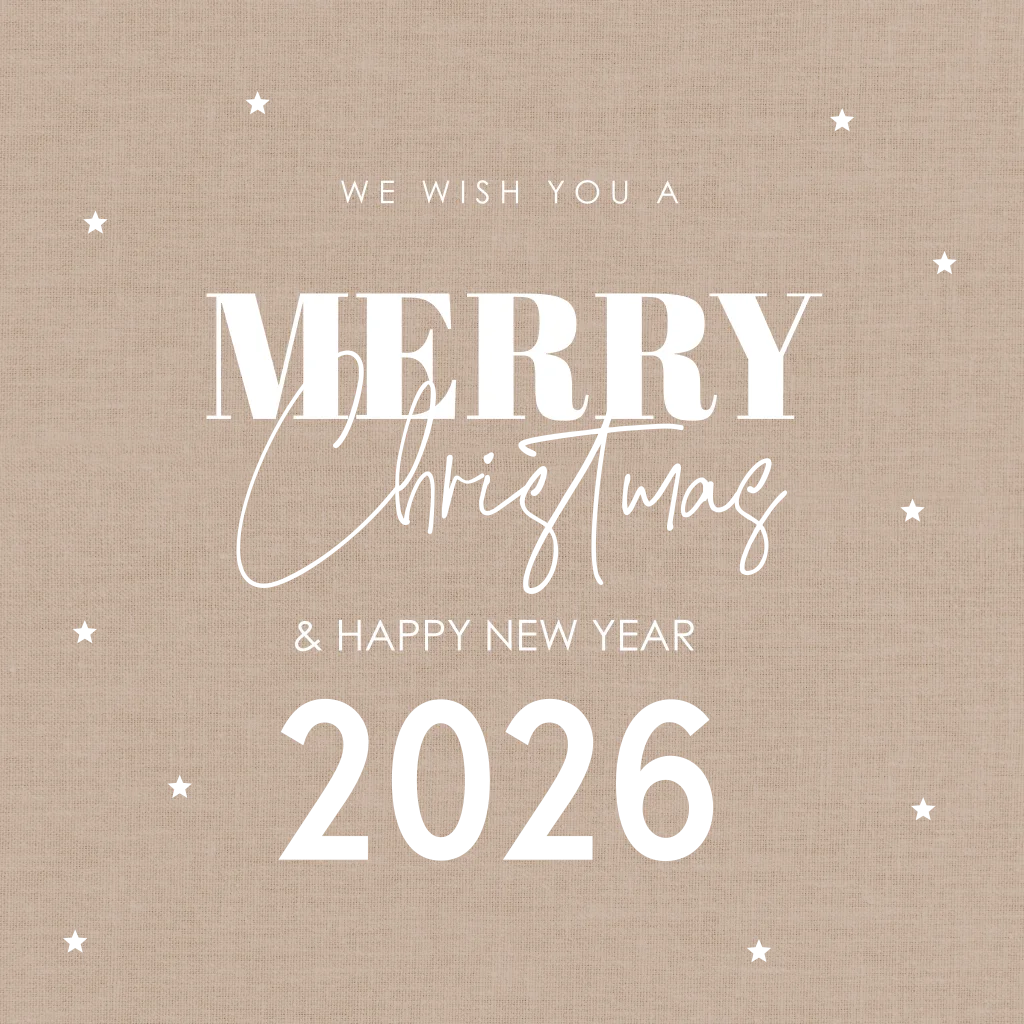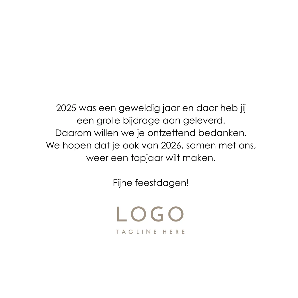 Stijlvolle zakelijke kerstkaart beige linnenlook met moderne typografie, jaartal 2026 en goudfolie.