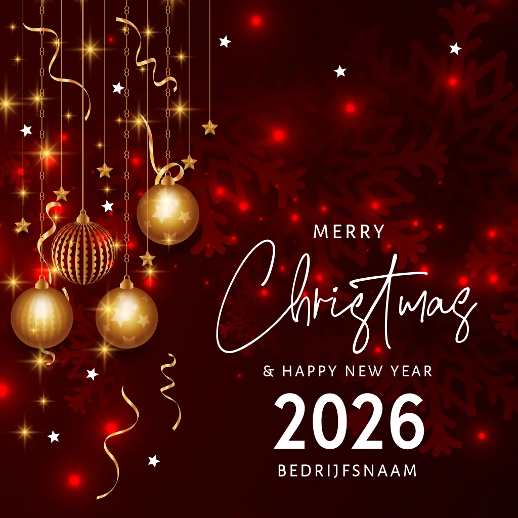 Zakelijke kerstkaart rood kerstballen 2026 goudfolie