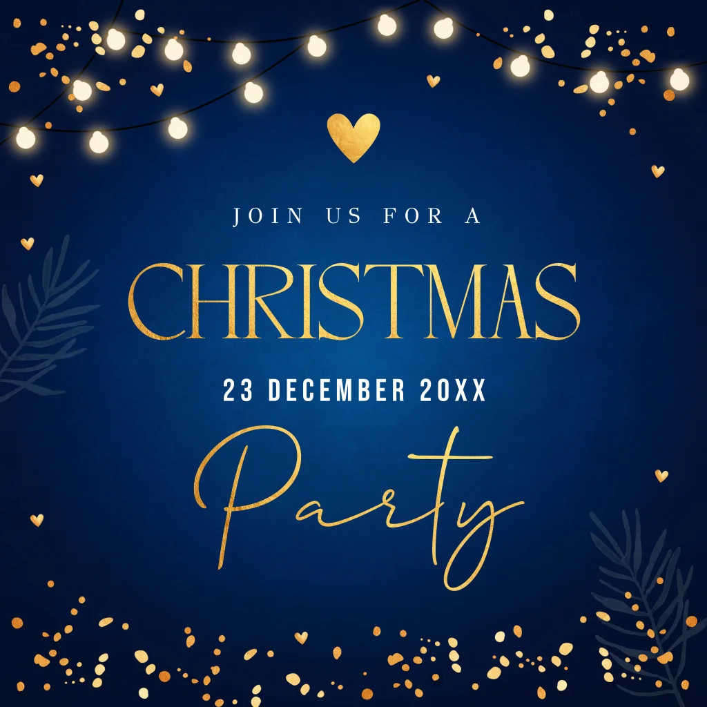 Zakelijke kerstborrel uitnodiging "Christmas Party" blauw met sfeervolle lampjes en goudlook. Geen folie!