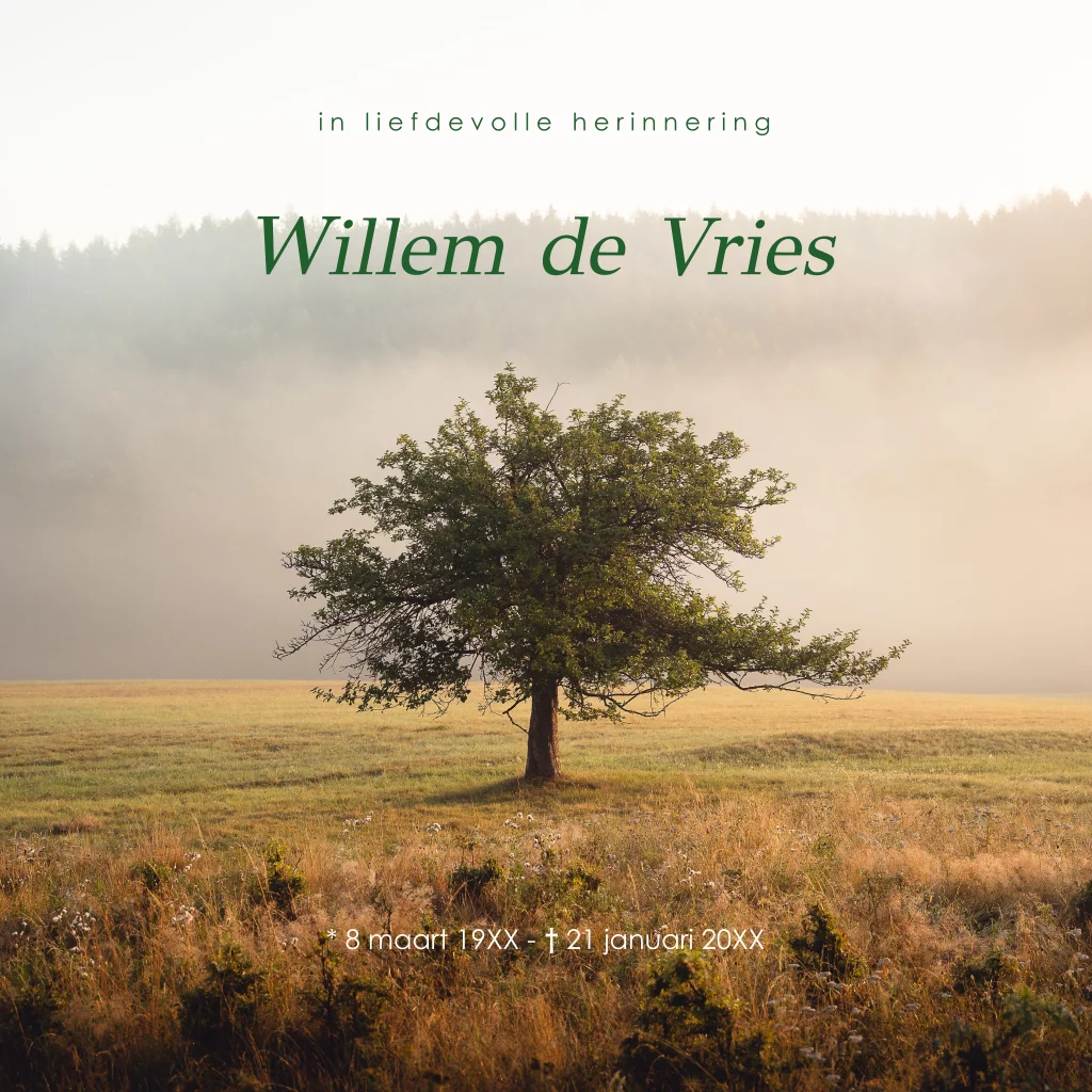 Rouwkaart voor een natuur liefhebber met prachtig landschap met een boom in het midden.