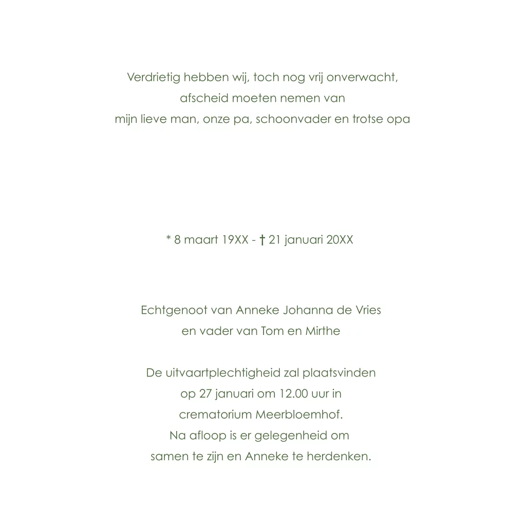 Stijlvolle en persoonlijke rouwkaarten online te bewerken met eigen tekst of eigen foto.