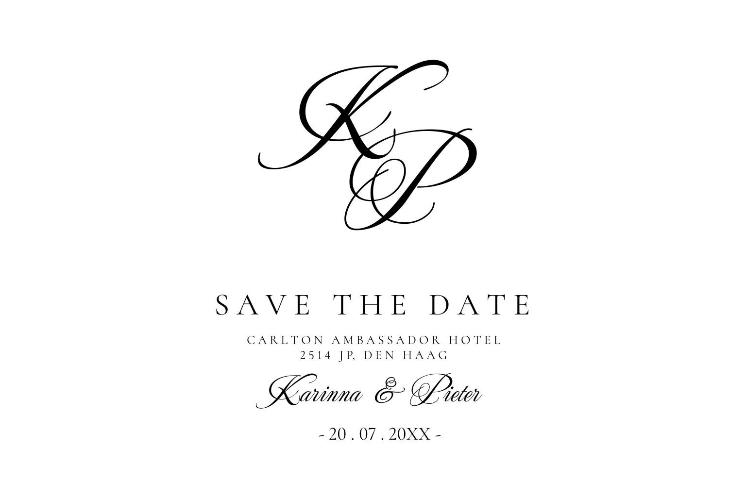 Klassieke Save the Date kaart zwart wit sierlijke initialen