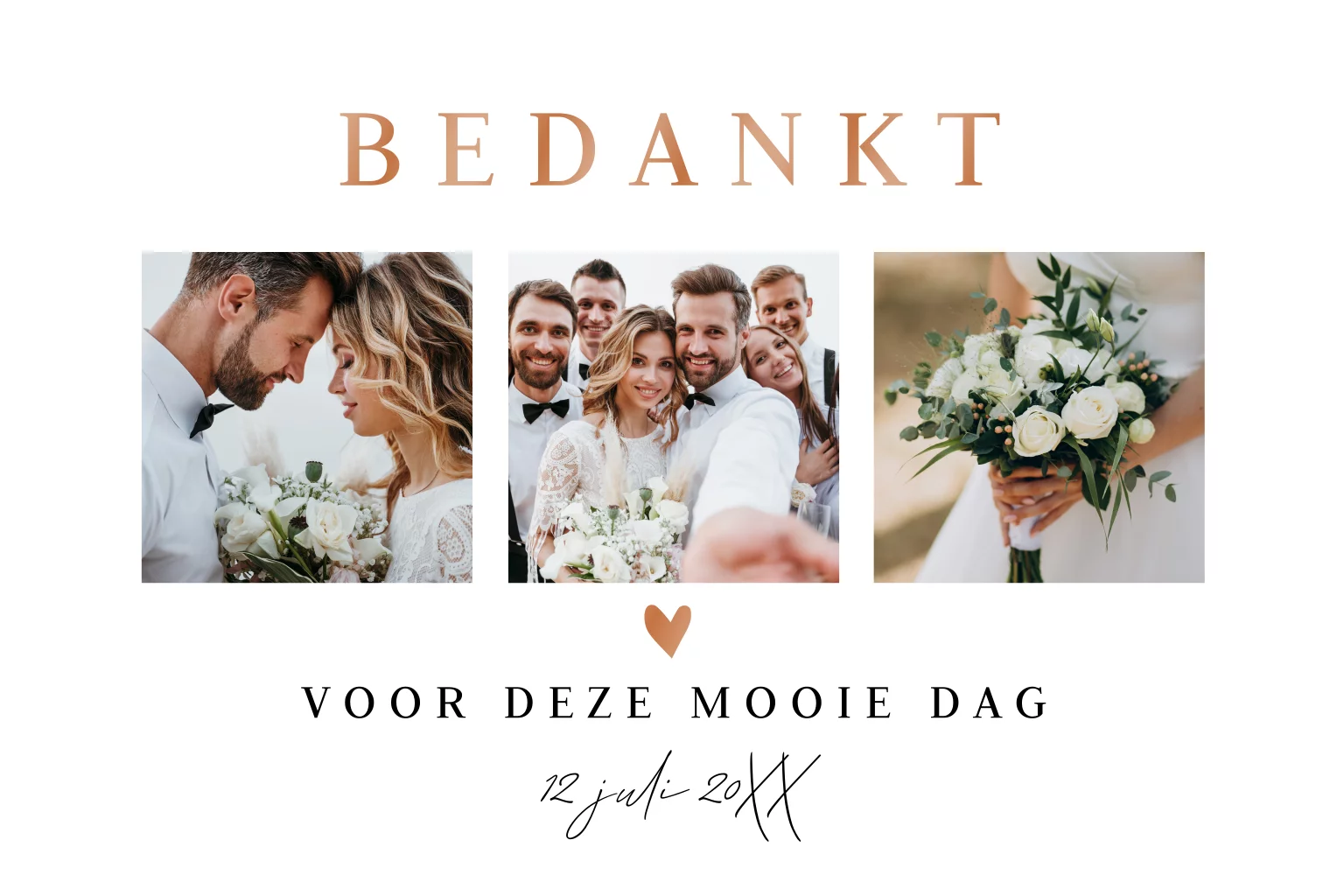 Bedankkaart huwelijk wit met fotocollage en hoogglans. Laat jullie bruiloftsgasten weten hoe geweldig de bruiloft was met deze stijlvolle bedankkaart!
