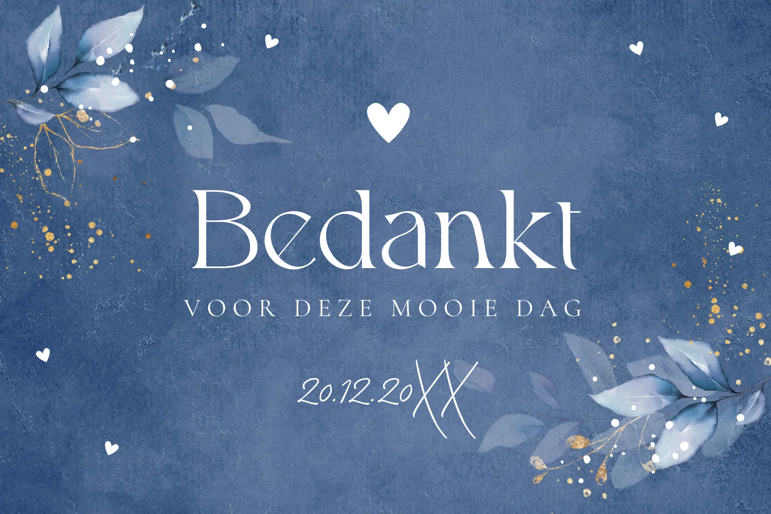 Bedankkaart huwelijk blauw met botanische blaadjes en goudfolie. Pas de kleur van de folie zelf eenvoudig aan.