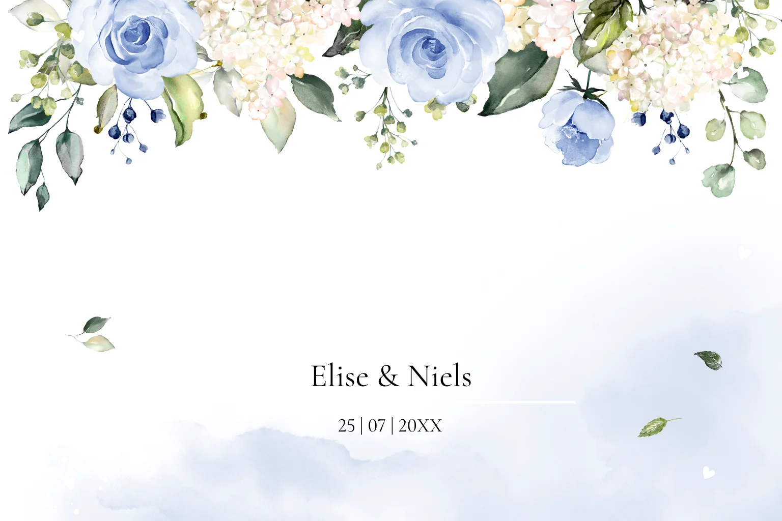 Bedankkaart huwelijk blauw watercolour bloemen rozen goudfolie