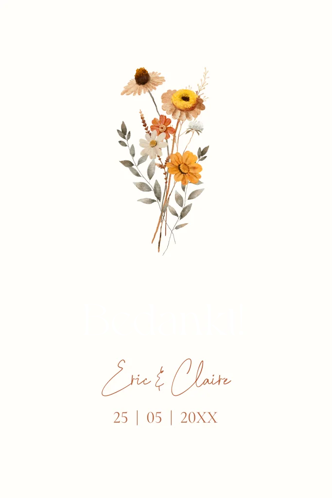 Bedankkaart huwelijk met bloemen boeket en goudfolie. Laat jullie bruiloftsgasten weten hoe geweldig de bruiloft was met deze stijlvolle bedankkaart!