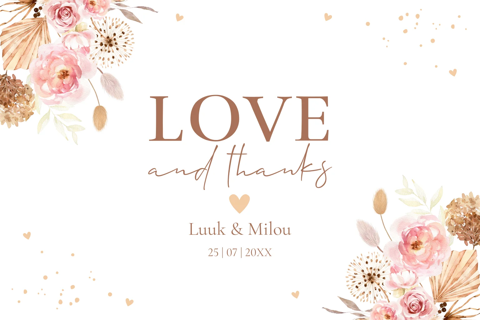 Bedankkaart huwelijk met bohemian bloemen. Bedank jullie gasten met deze prachtige bedankkaart!