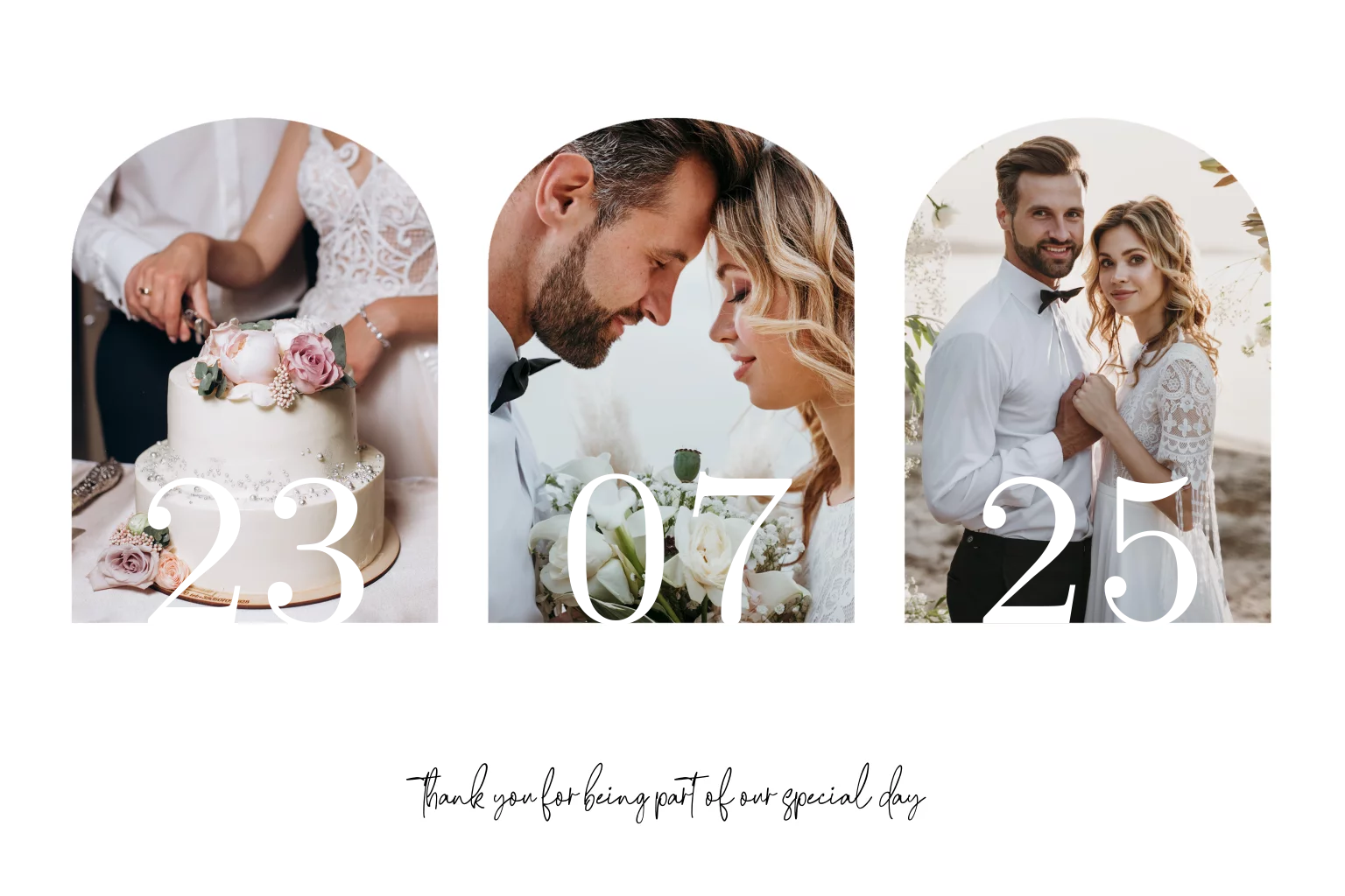 Bedankkaart huwelijk wit fotocollage boog rosegoudfolie