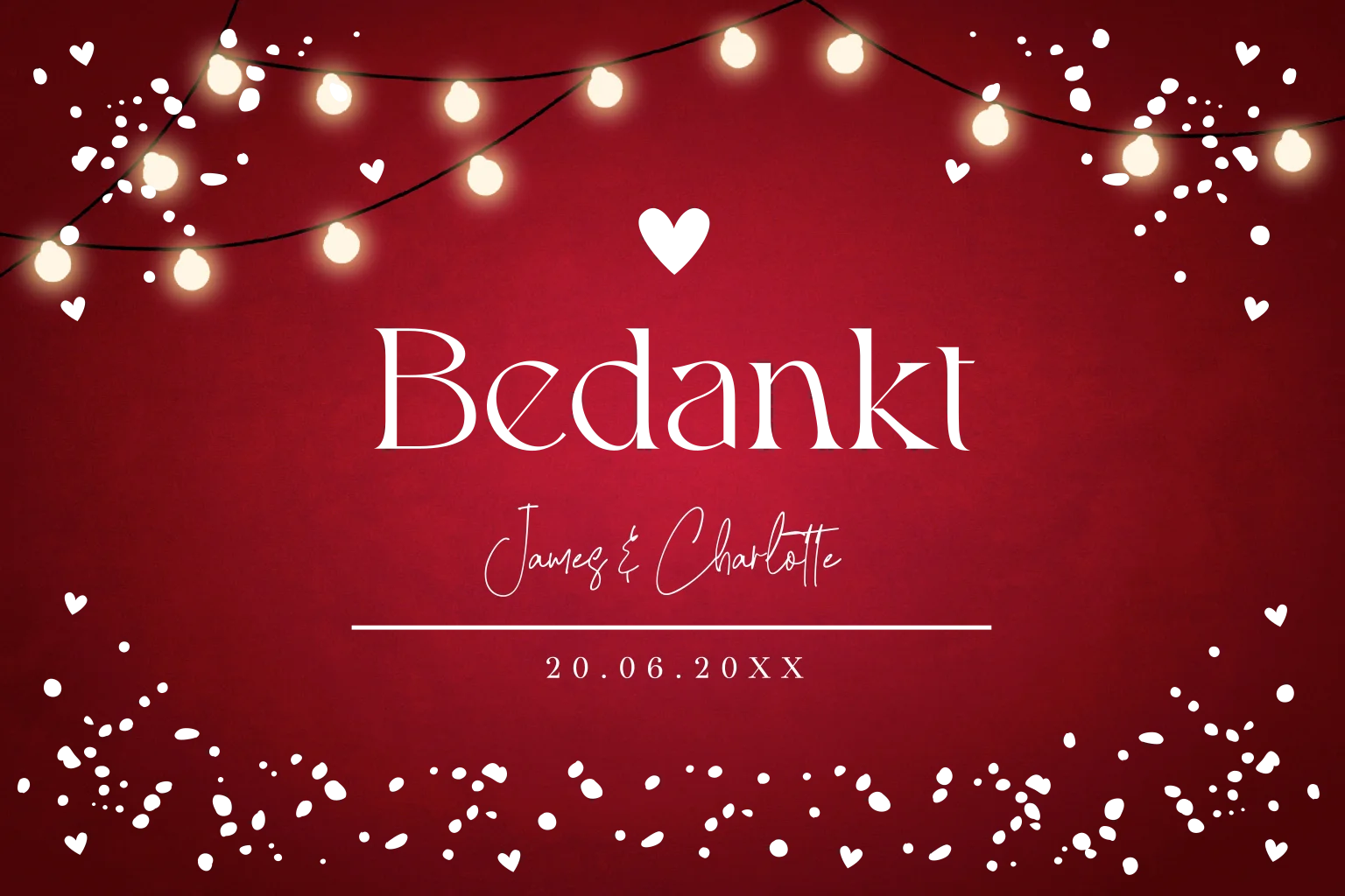 Bedankkaart huwelijk kerst rood met goudlook spetters, hartjes, sfeervolle lampjes en goudfolie. Bedank jullie gasten voor een onvergetelijke dag met deze prachtige bedankkaart.