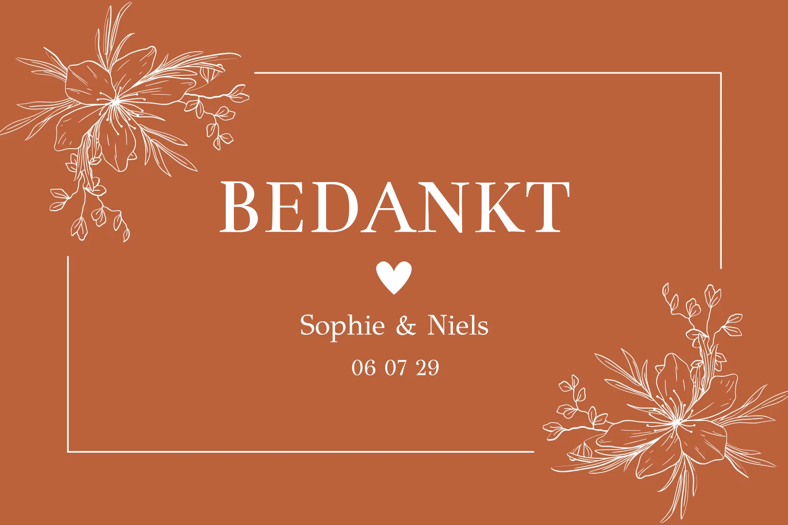 Bedankkaart huwelijk roestbruin met bloemen fram en goudfolie. Laat jullie bruiloftsgasten weten hoe geweldig de bruiloft was met deze stijlvolle bedankkaart!