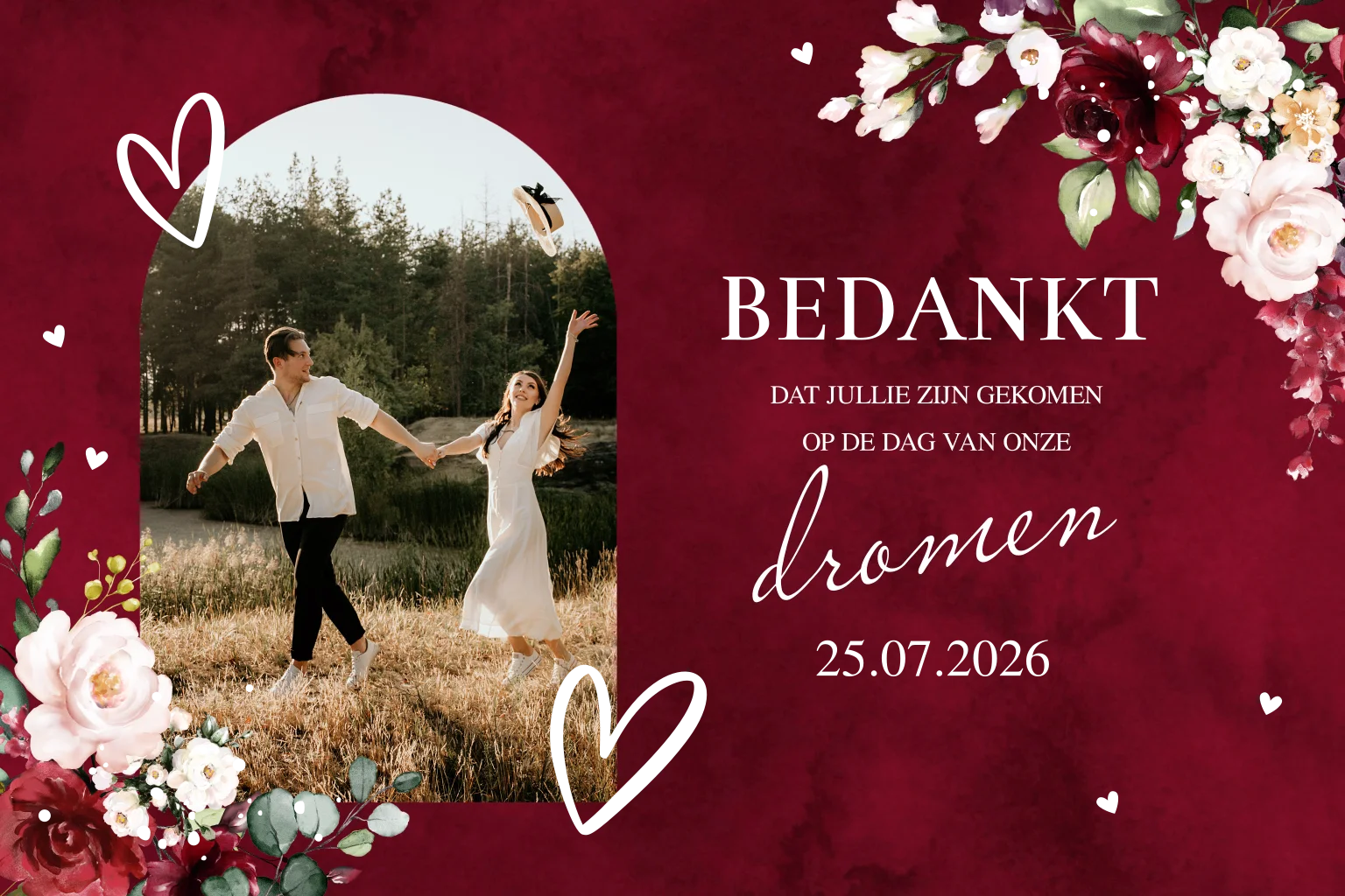 Bedankkaart huwelijk rood foto boog vorm bloemen goudfolie