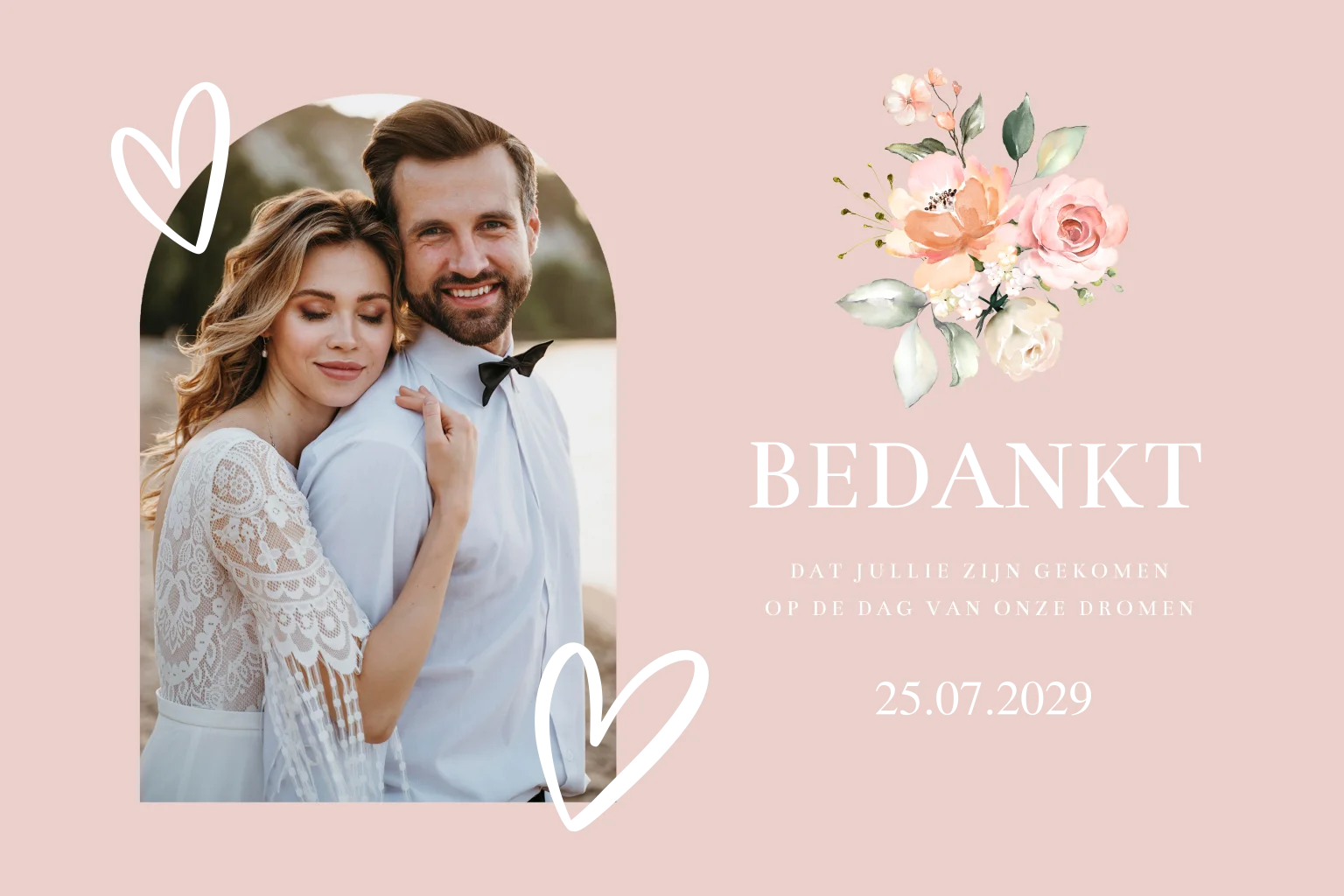 Bedankkaart huwelijk roze foto boog bloemenboeket goudfolie