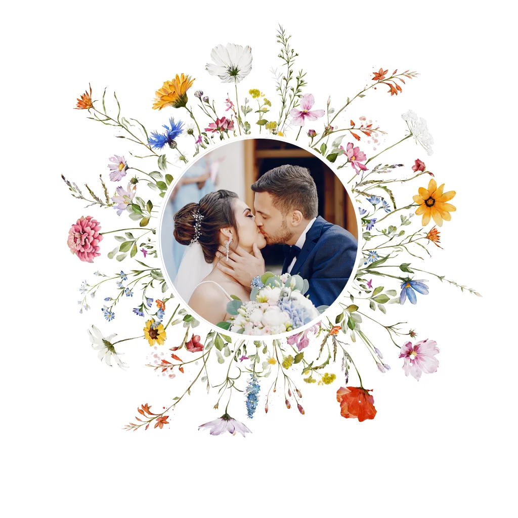 Bedankkaart huwelijk wit met eigen foto, zomerse bloemen en goudfolie. Bedank jullie gasten voor een onvergetelijke dag met deze prachtige bedankkaart.