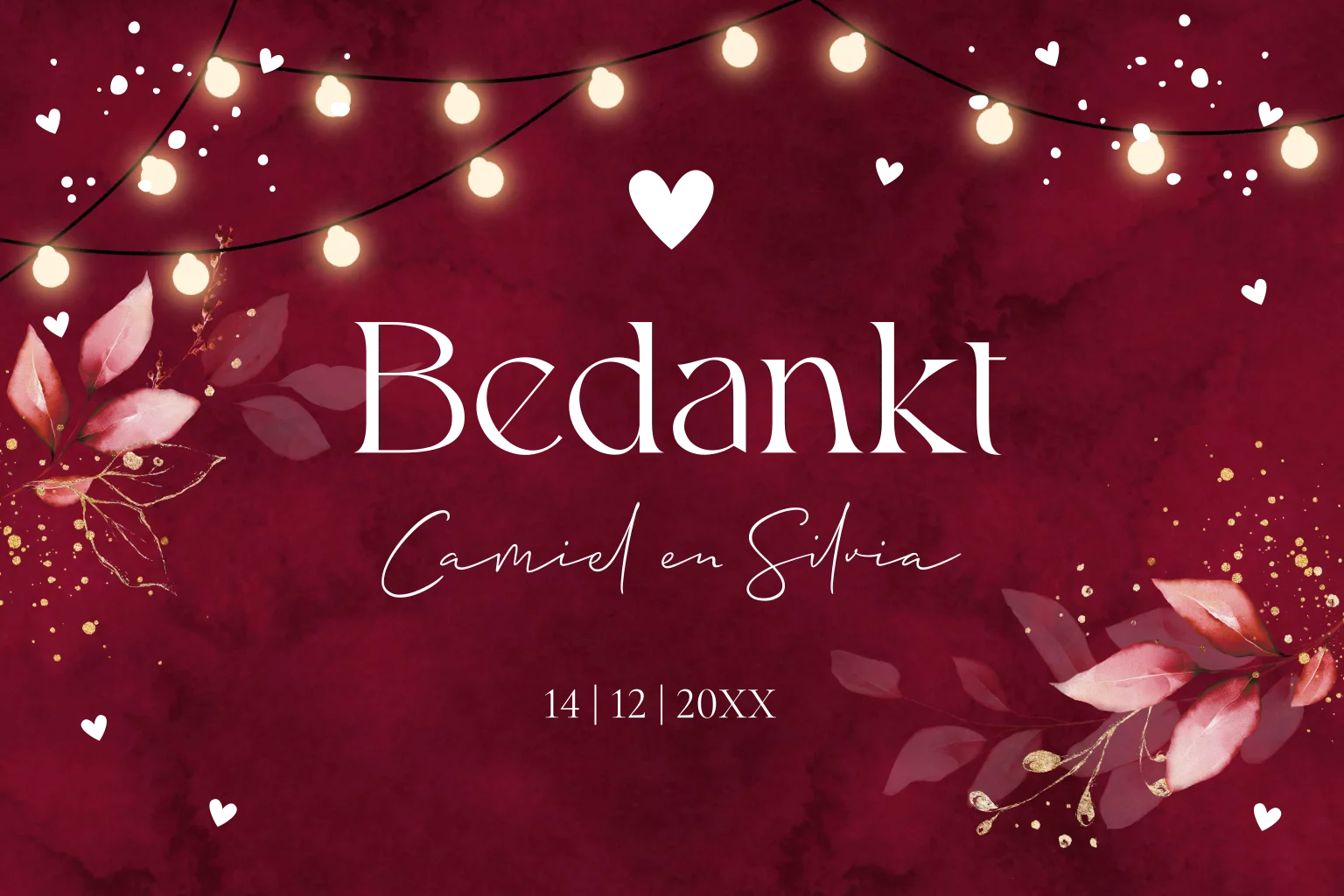 Bedankkaart rood met goudfolie, bladeren, hartjes en lampjes. Bedank de gasten van jullie speciale dag met dit prachtige kaartje!