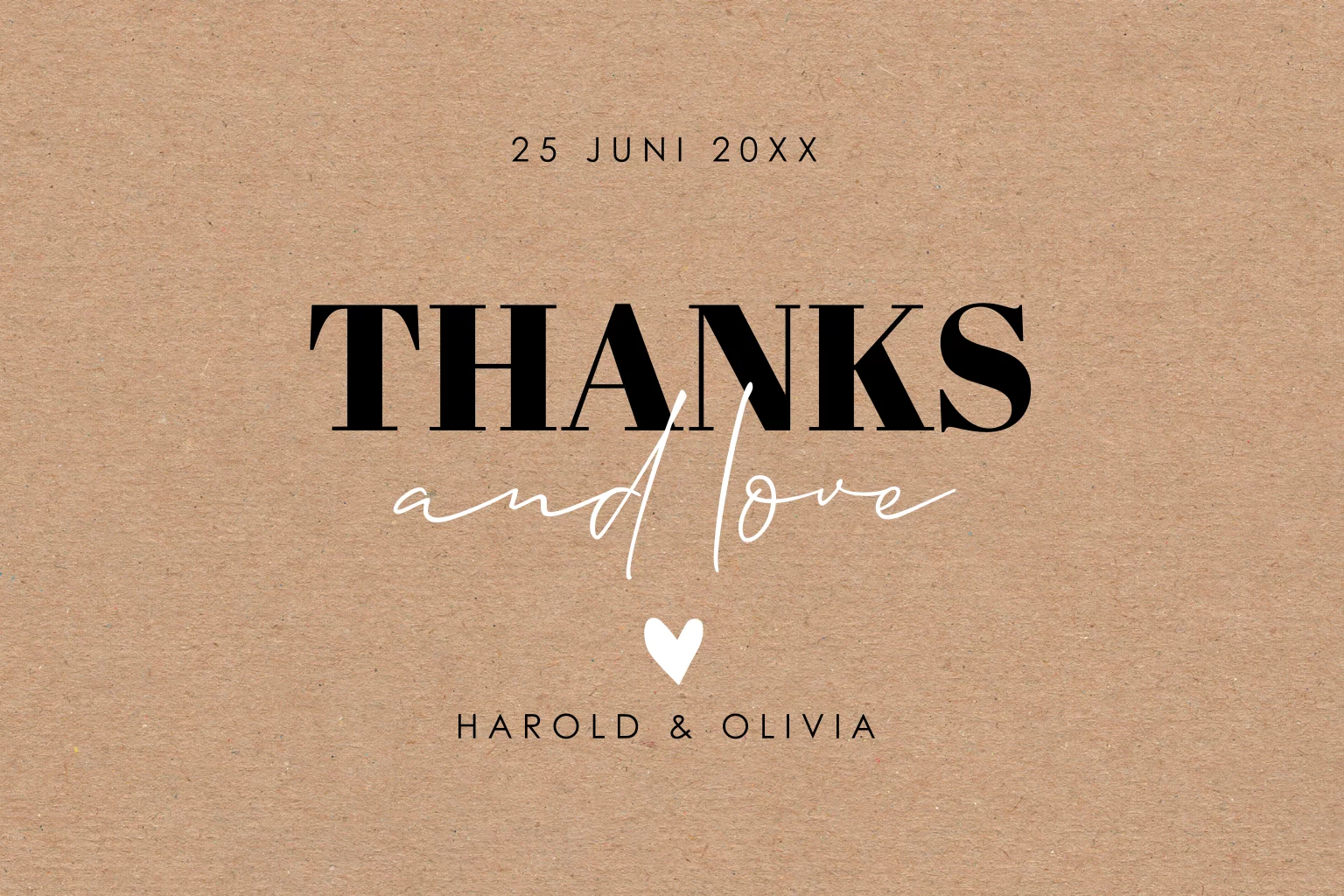 Bedankkaart huwelijk met kraftook bruin en mooie typografie. Bedank jullie gasten voor een onvergetelijke dag met deze prachtige bedankkaart.