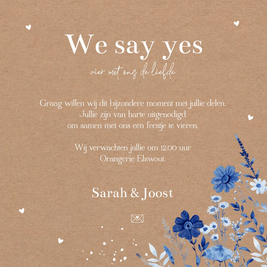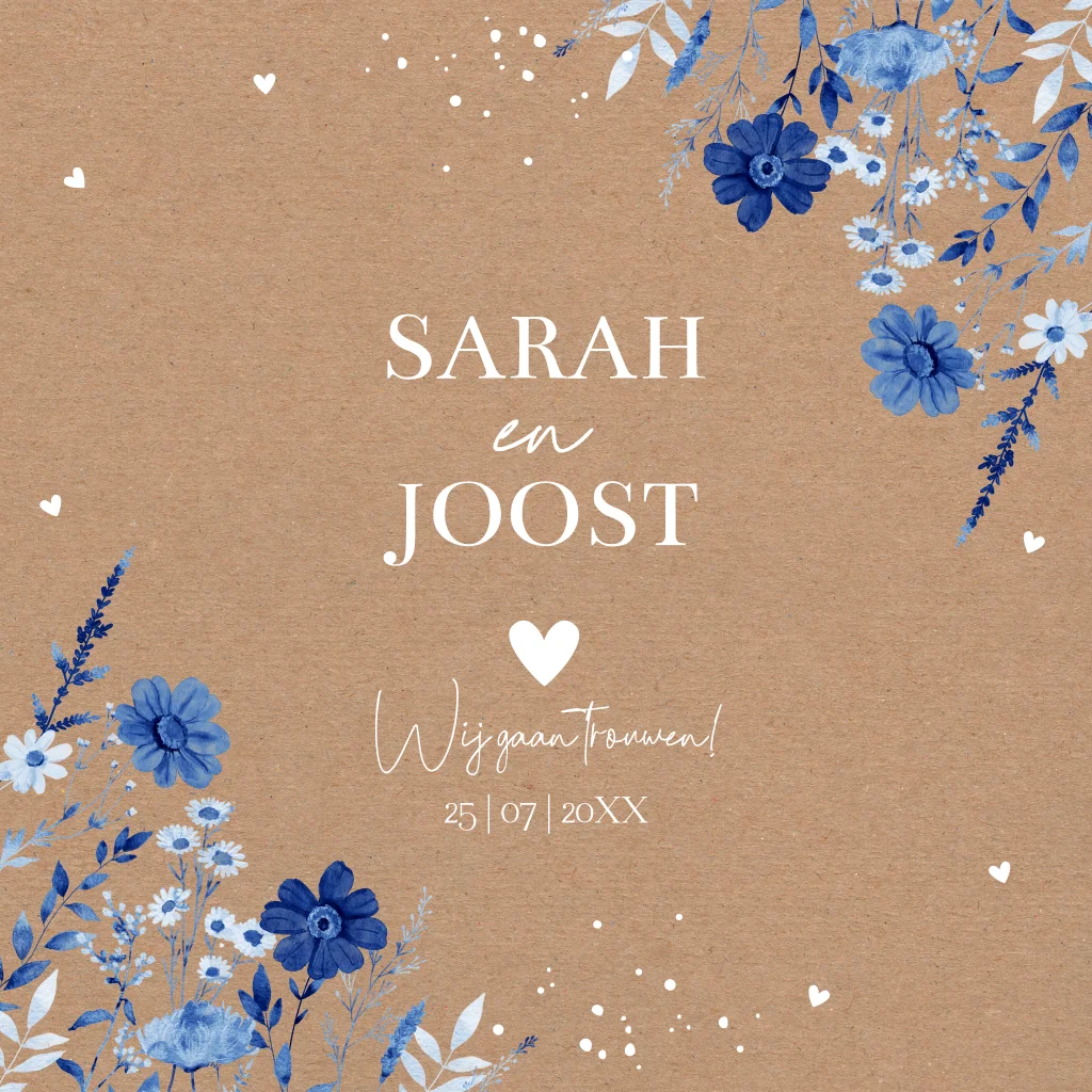 Trouwkaart bloemen blauw kraftlook bruin