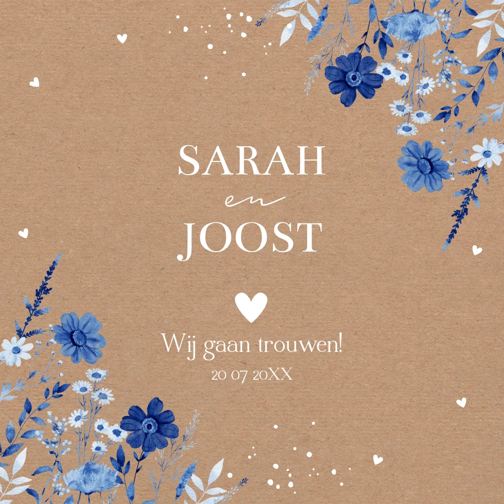 Trouwkaart met watercolour bloemen in de stijl van Delfts blauw. De kraftlook achtergrond kan je zelf aanpassen naar een andere kleur.