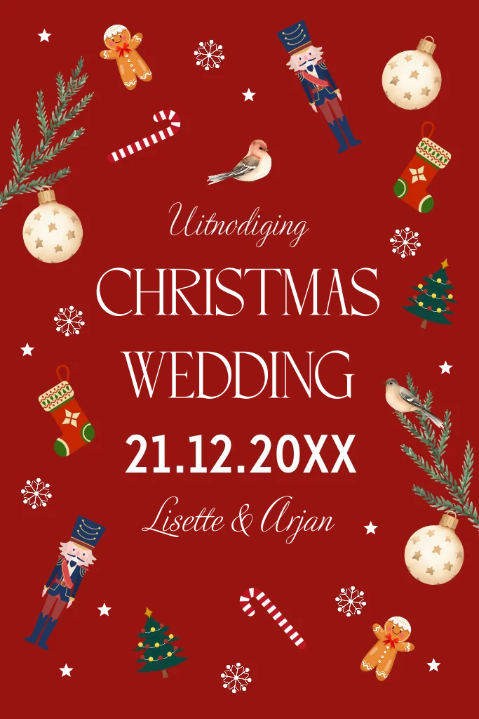 Christmas Winter Wedding trouwkaart rood met kerst figuurtjes en goudfolie.