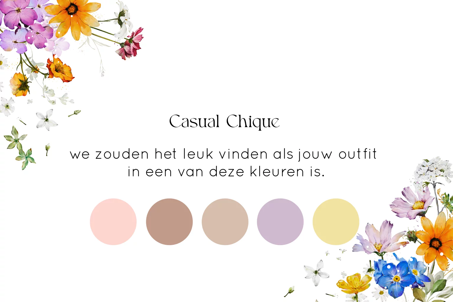 Dresscode kaartje bruiloft bloemen casual chique kleurenpalet