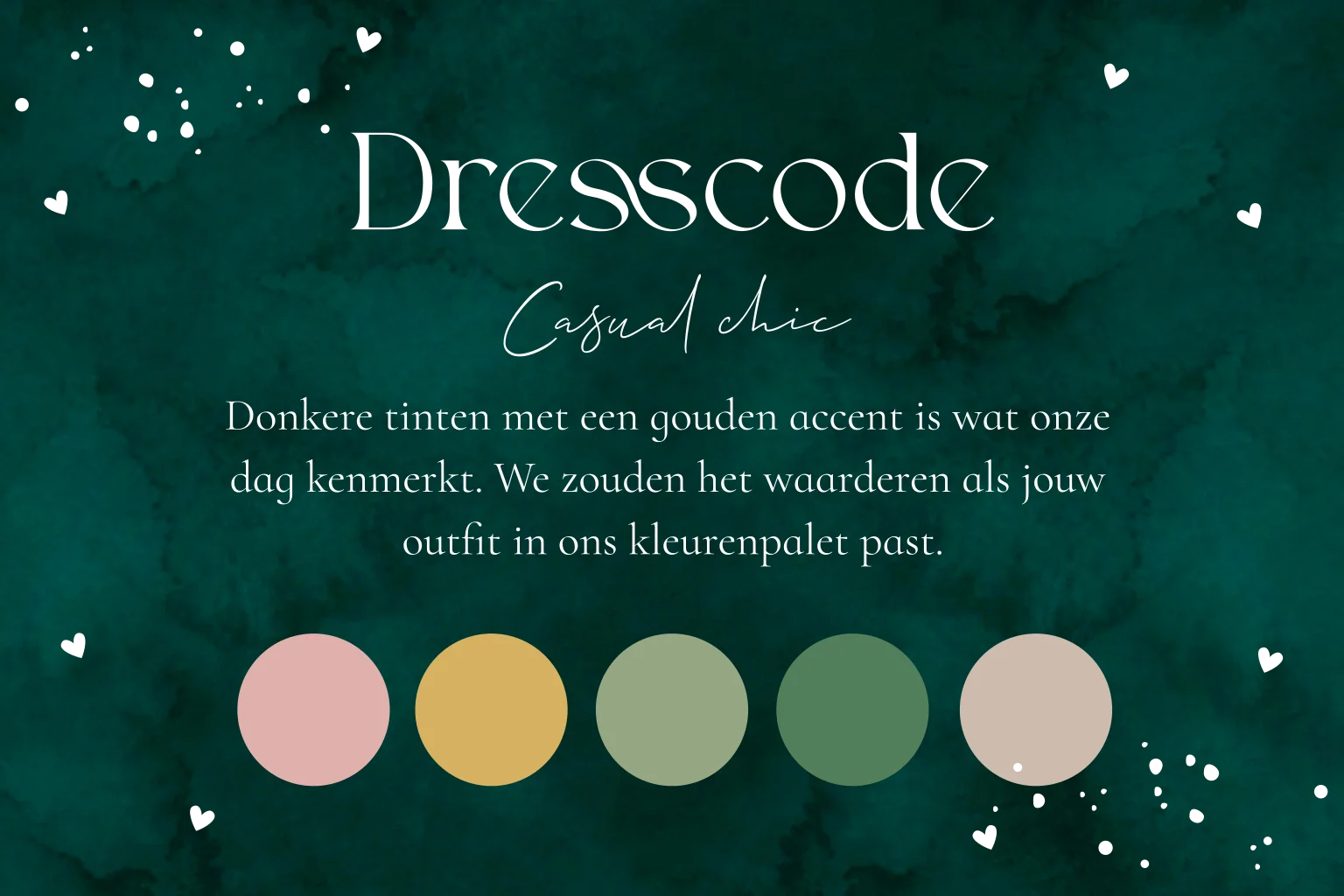 Dresscode kaartje casual chique huwelijk kleurenpalet goud groen