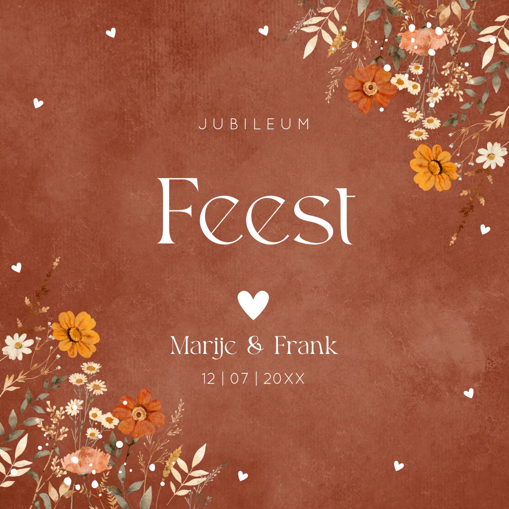 Uitnodiging jubileum huwelijk 50 jaar getrouwd roestbruin met bloemen en goudfolie. Pas de tekst en jaartal naar wens aan!