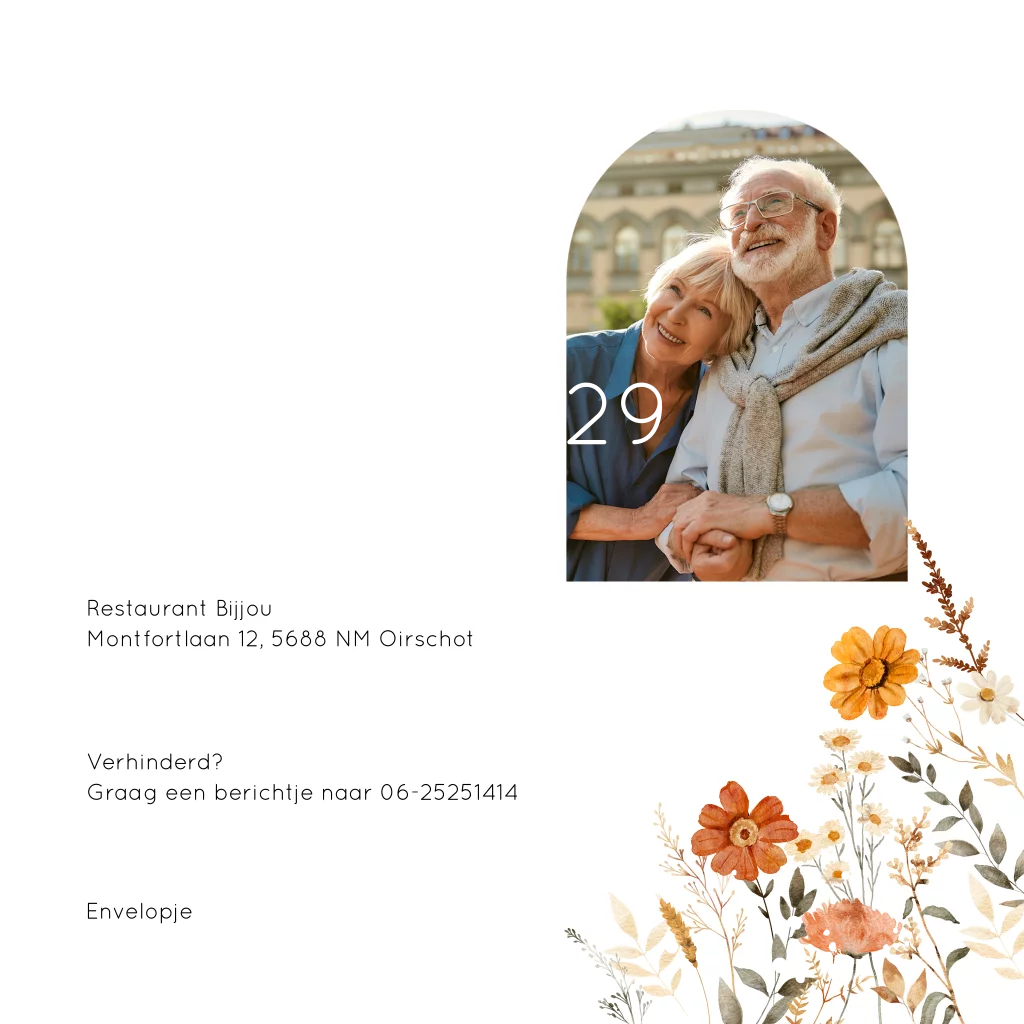 Uitnodiging jubileum 50 jaar getrouwd roestbruin bloemen goudfolie