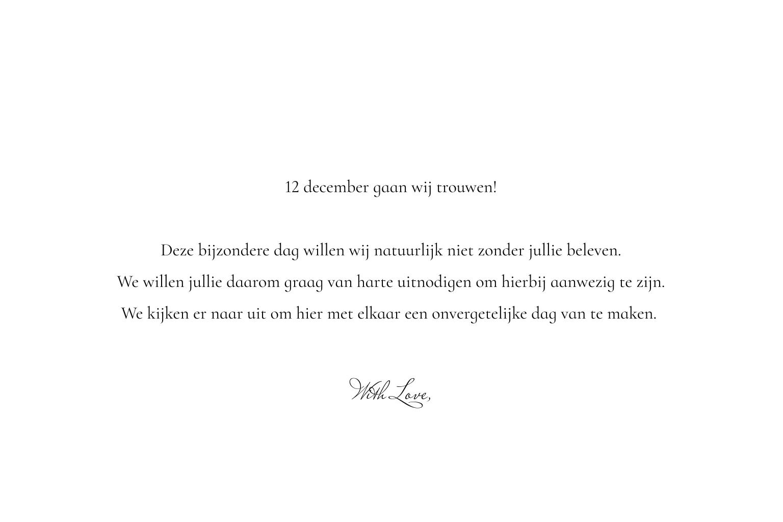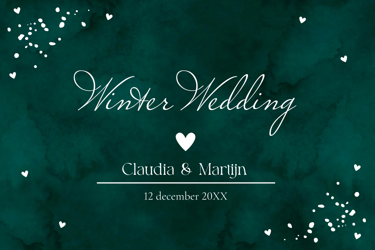 Stijlvolle kerst trouwkaart donkergroen met hartjes, spetters en goudfolie. Nodig jullie gasten uit met deze elegante trouwkaart!