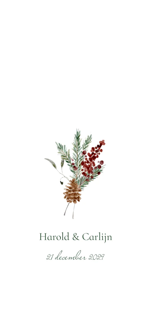 Kerstmenukaart langwerpig wit kerststuk groen goudfolie