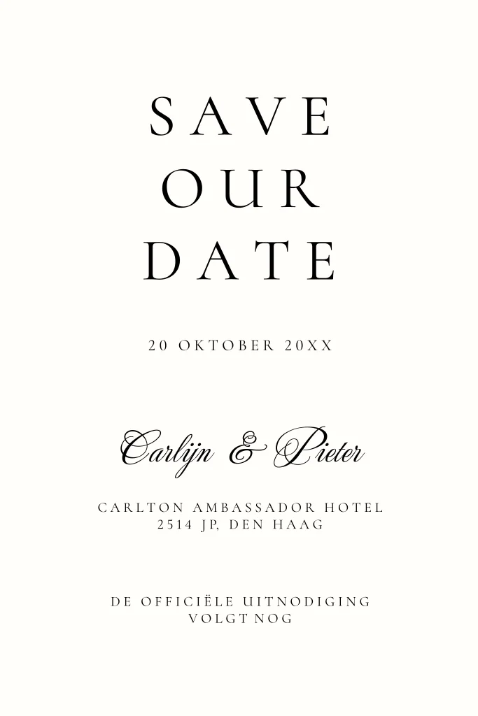 Klassieke Save the Date uitnodiging wit met mooie typografie. Maak jullie trouwdatum bekend met deze stijlvolle save the date!