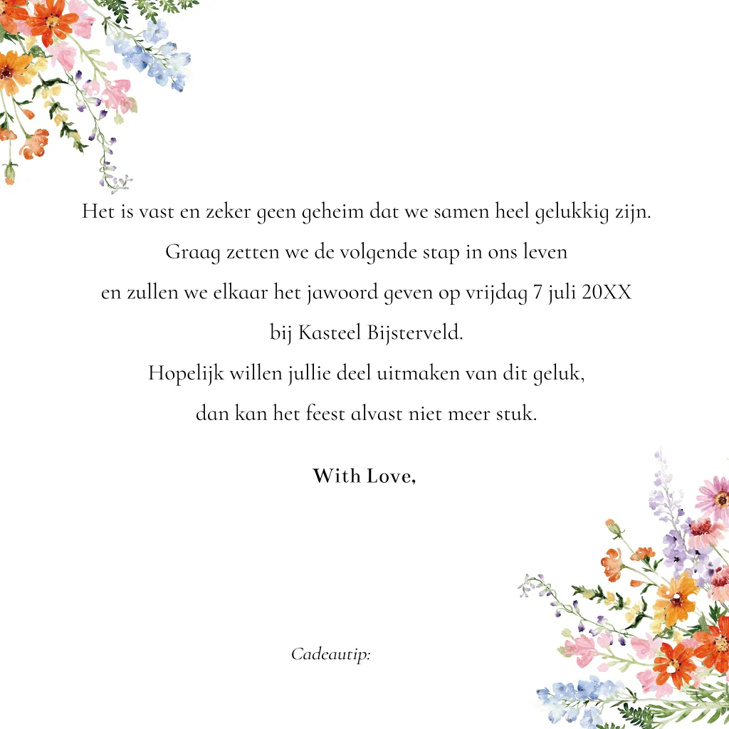 Romantische trouwkaart wit met gekleurde watercolour bloemen en luxe goudfolie. In de binnenkant kan je een foto toevoegen.