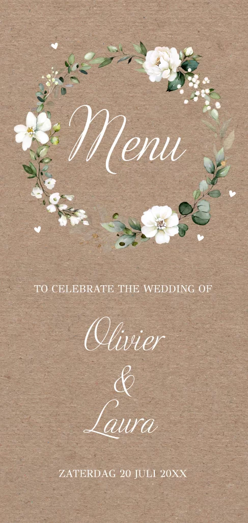 Menukaart langwerpig met bloemenkrans en kraftlook.