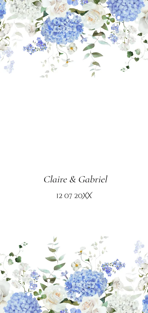 Menukaart bruiloft landelijk wit bloemen blauw hortensia goudfolie